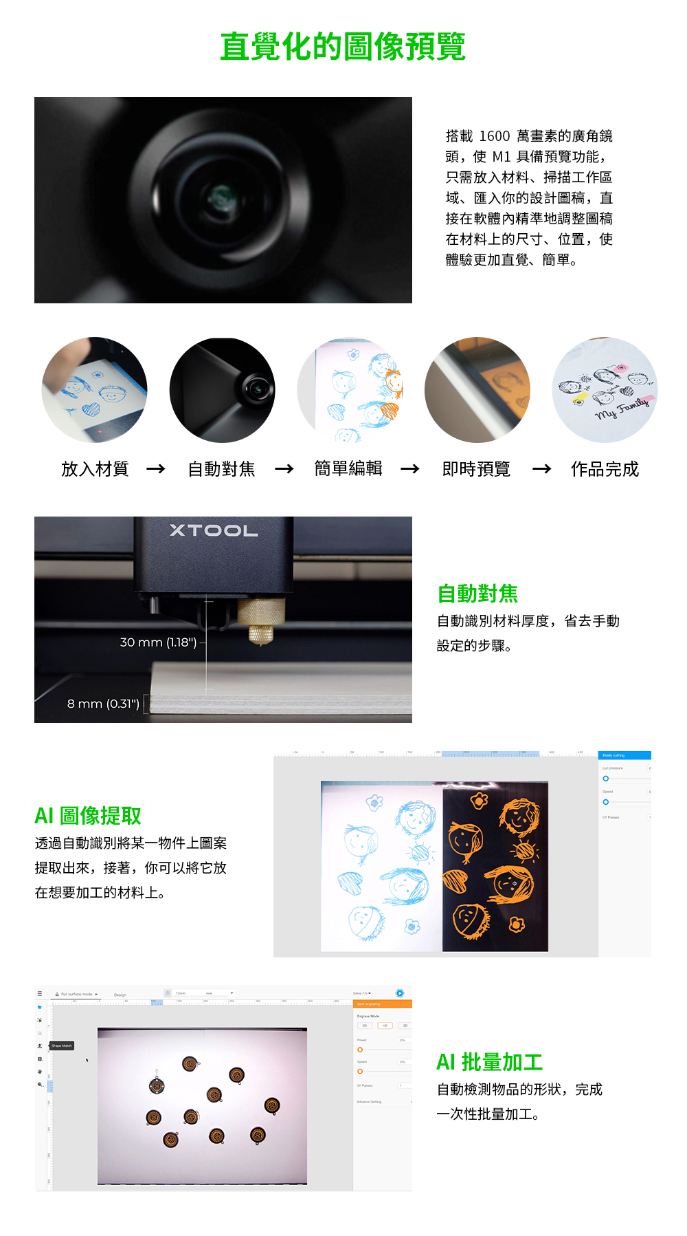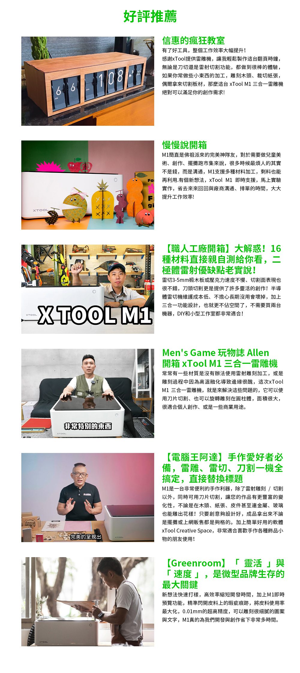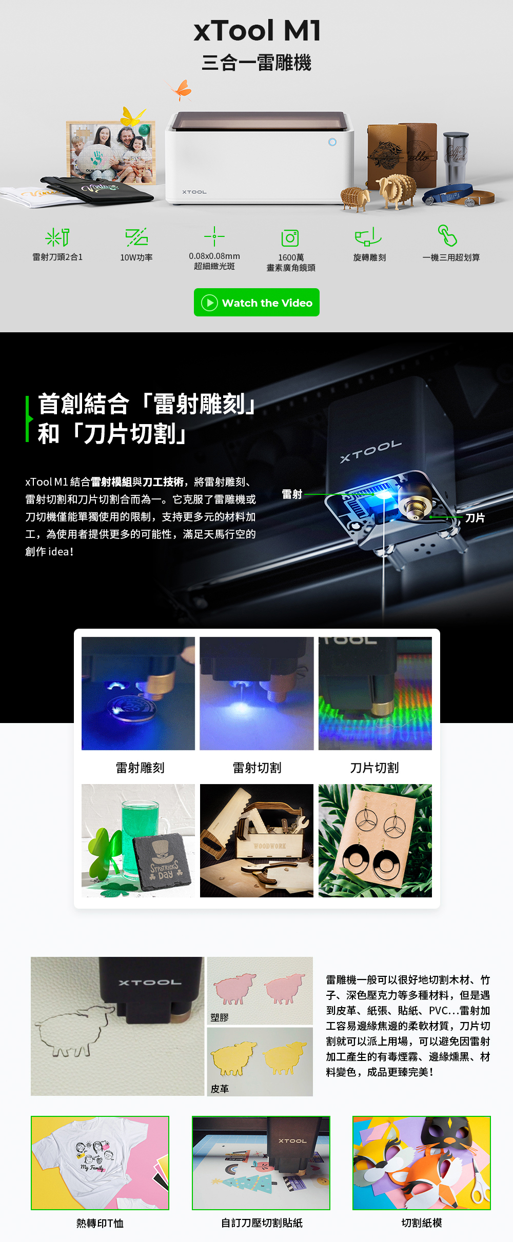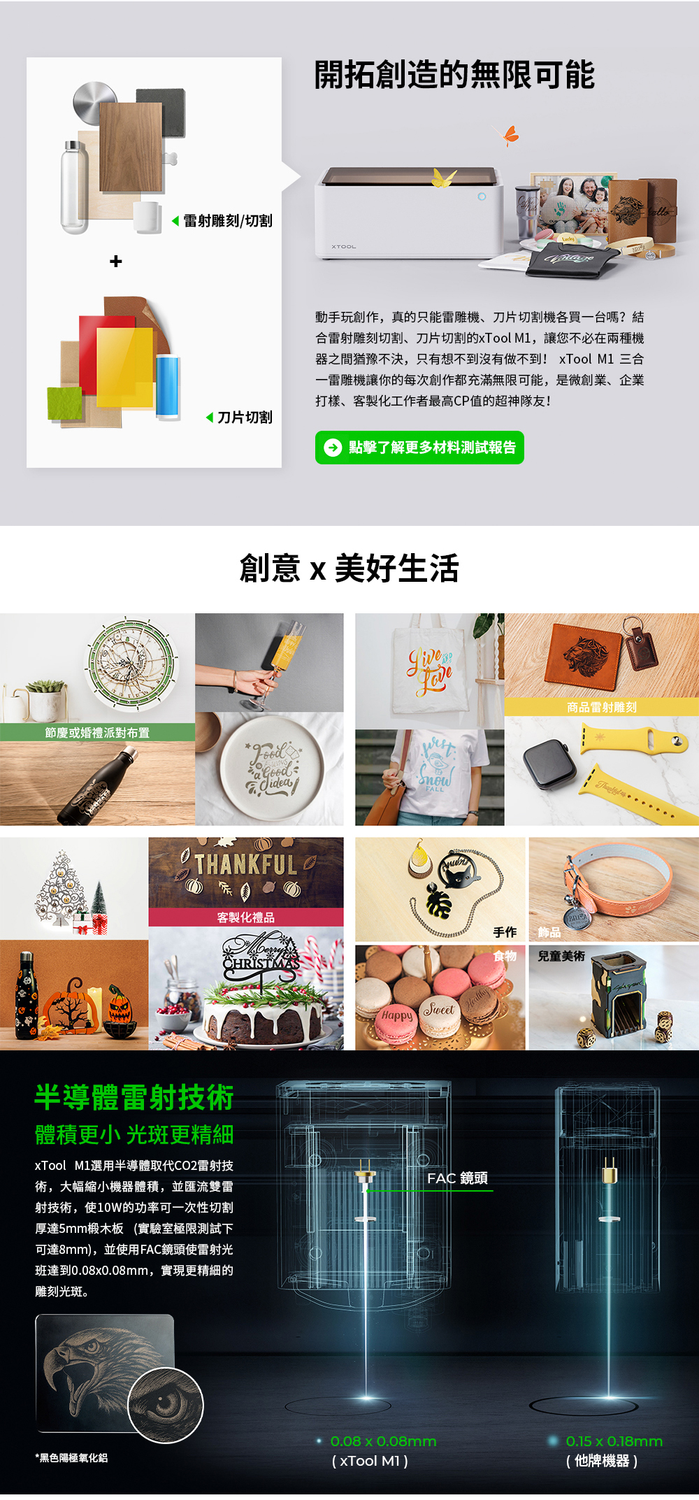 xTool M1 結合雷射和刀片切割技術,它克服了雷雕機或刀切機僅能單獨使用的限制,支持更多元的材料加工,為使用者提供更多的可能性,滿足天馬行空的創作idea!