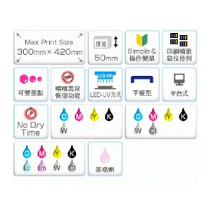 由於使用發熱少的LED燈UV光源技術,遇熱容易變形的材料也可以。由於噴墨後瞬間固化使得工作效率大幅提高。