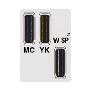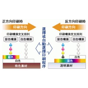 由於採用了2列錯開排列的全彩噴頭和白色噴頭,實現了從前機型必須經過另一工程次印刷才能達到的全彩色和白色同時印刷。因此,可採用白色墨水,但並不降低速度的噴墨印刷,效率提高了2倍。※SP可設置成白墨也可設置成亮光漆。