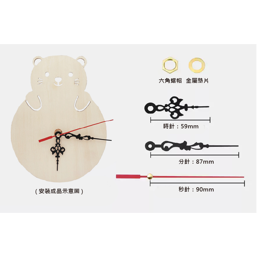 配 件:機芯、六角螺帽、金屬墊片、時針、分針、秒針
