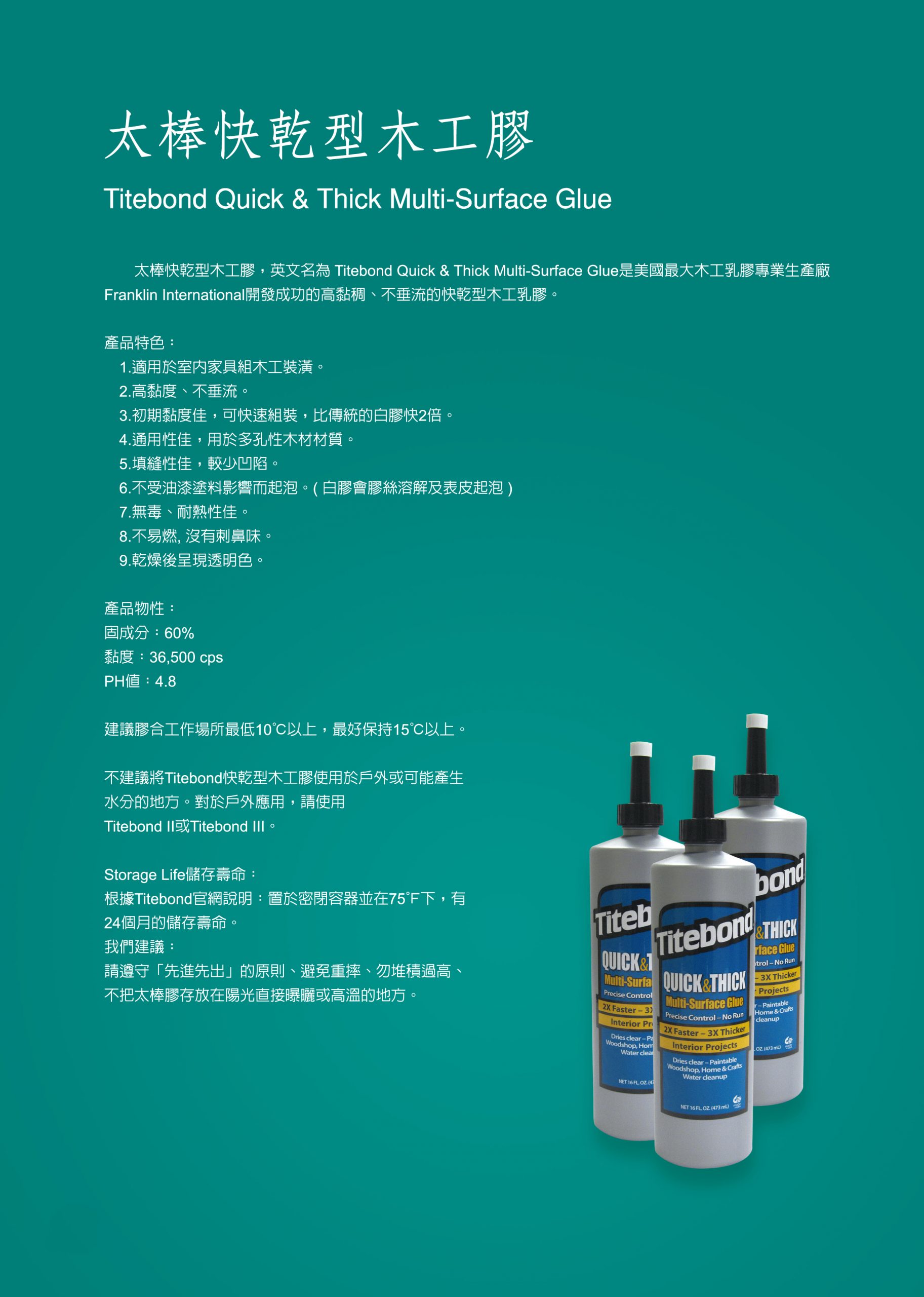 太棒 快乾型木工膠,英文名為Titebond Quick & Thick Multi-Surface Glue是美國最大木工乳膠專業生產廠Franklin International開發成功的高黏稠、不垂流的快乾型木工乳膠。