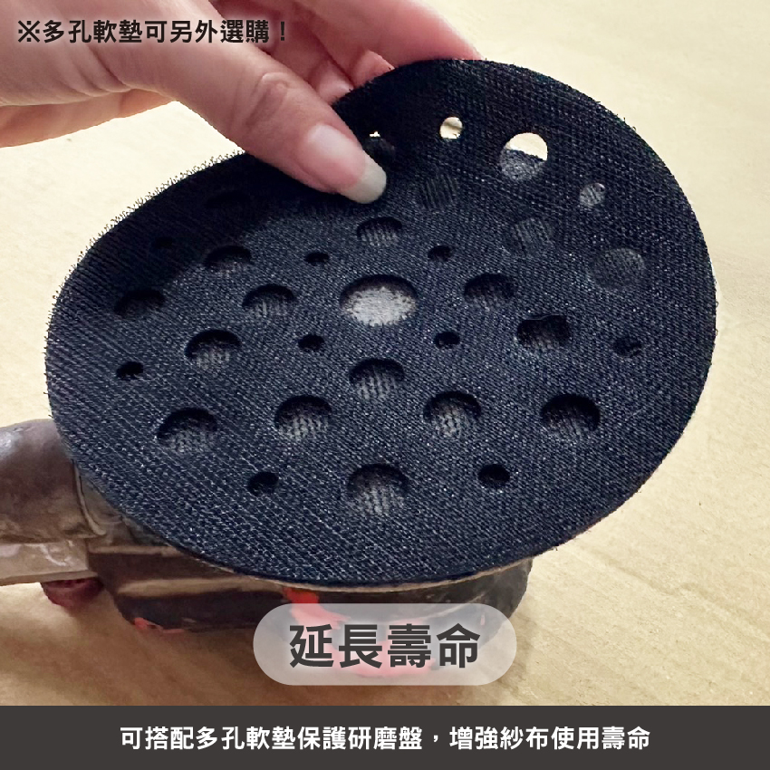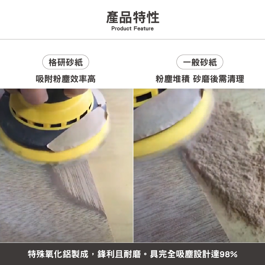 特殊氧化鋁製成,鋒利且耐磨。具完全吸塵設計達98%,不堵塞。 耐用壽命長,可重複使用。多孔軟墊保護研磨盤,增強紗布使用壽命。