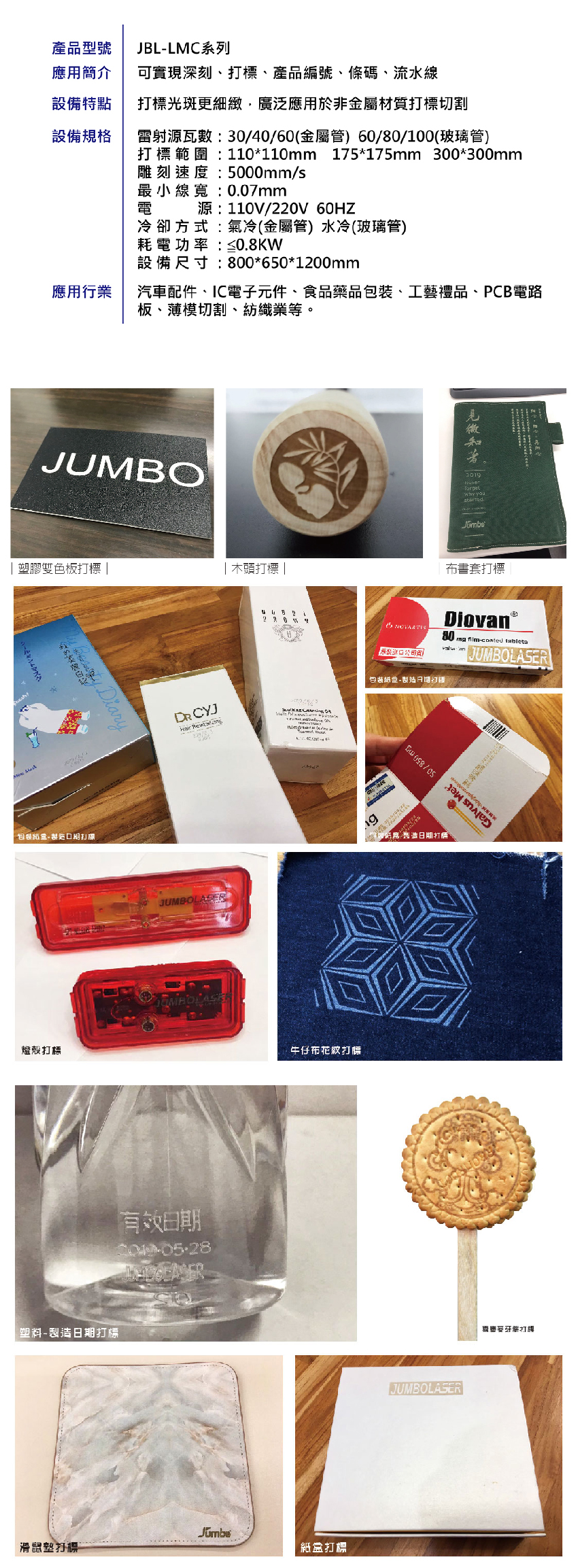 一、規格參數: 1.打標範圍:110mm*110mm 2.最大線速:4000mm/s 3.最小線寬:0.1mm 4.可調頻率:0~100kHz 5.電源供應:1kw/AC220v/60Hz 6.最佳工作環境:0~35°C,<90%濕度 7.冷卻方式:氣冷式 二、雷射源: 1.CO2雷射30W/波長10600nm 2.繁體中文打標軟體 三、基本配件: 1.教育訓練2小時(提供基本現場試樣教學) 四、配件: 電腦周邊、操作手冊、500mmZ軸升降、紅光對位。
