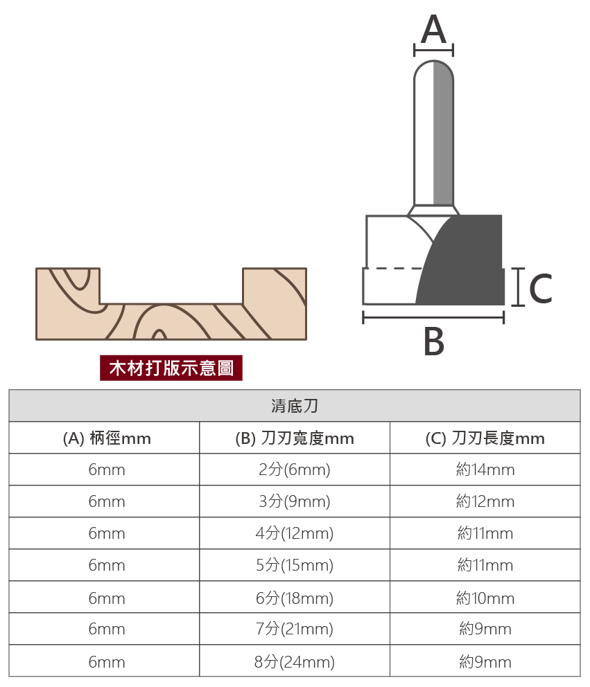 品名:清底刀 柄徑:6mm 尺寸:2分(6mm)/3分(9mm)/4分(12mm)/5分(15mm)/6分(18mm)/7分(21mm)/8分(24mm) 適用:修邊機 用途:修整底部刀具