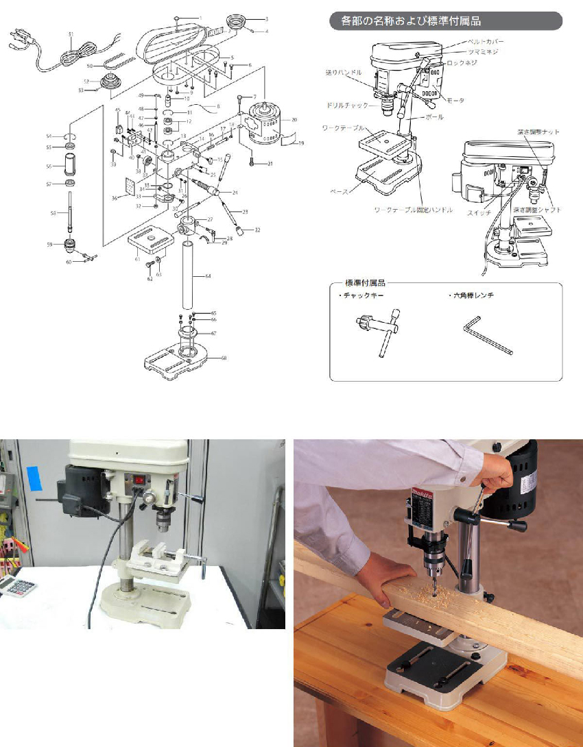 工作能力 .鑽孔:木工24mm/鐵工13mm .電流:3.8(安培) .電線:1.75m .主軸最大行程:52mm 回轉數rpm: 690/1,070/1,560/2,280/3,200rpm 耗電量:0.25kW 尺寸(長x寬x高):580mm 重量:20kg 主軸最大行程:52mm