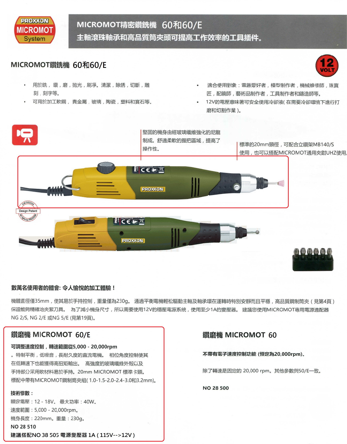 鑽磨機MICROMOT 60/E .可調整速度控制,轉速範圍從5000-20000 rpm .特制平衡,低噪音,長耐久度的直流電機 .相位角度控制使其在低轉速下也能獲得高扭矩輸出 .高強度的玻璃纖維外殼以及手持部分採用軟材料易於手持 .20mm MICROMOT標準卡頸 .標配中帶有MICROMOT鋼制筒夾組(1.0-1.5-2.0-2.4-3.0和3.2mm)