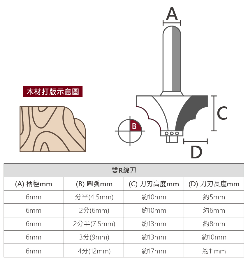 品名:雙R線刀 柄徑:6mm 尺寸:分半(4.5mm)/2分(6mm)/2分半(7.5mm)/3分(9mm)/4分(12mm) 適用:修邊機 用途:側邊施做線條(兩個圓弧)