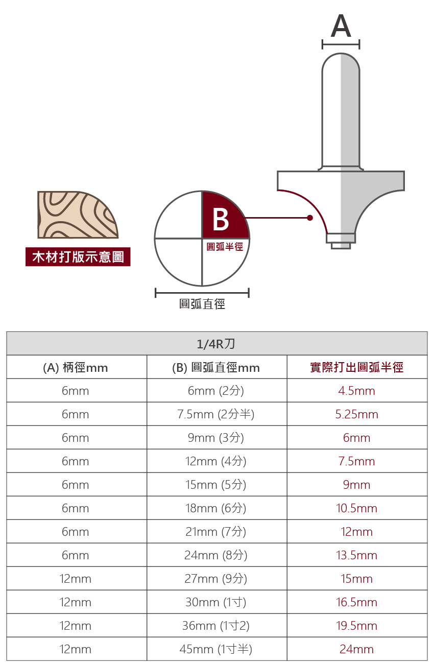 ※因圓弧頭端和尾端會延伸一點出去,故賣場規格請多抓一分為實際尺寸 適用:木材側邊修成1/4圓的弧度,圓弧導角加工後不利手