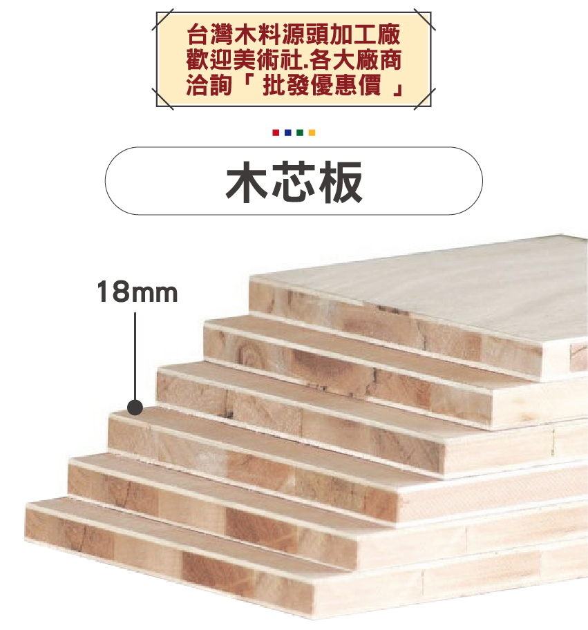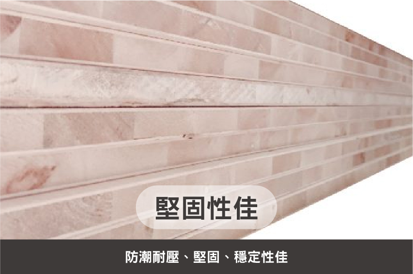 為上下兩層薄木片製成,中間則以實木條拼貼而成,常用於製作櫥櫃家具、大面積桌面、木工裝潢現場施工等,防潮耐壓、堅固、重量輕、穩定性佳、方便現場施工。