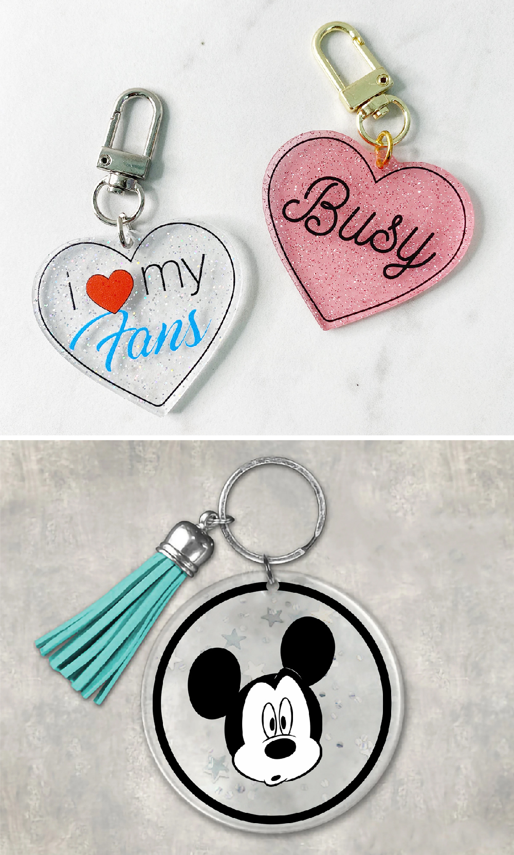 金蔥板壓克力製作各項工藝品、鑰匙圈、耳環飾品、立牌、招牌等…更能凸顯作品層次感及吸睛度,內裡雷射金蔥粉,光照下呈現多種七彩色澤,耀眼奪目。