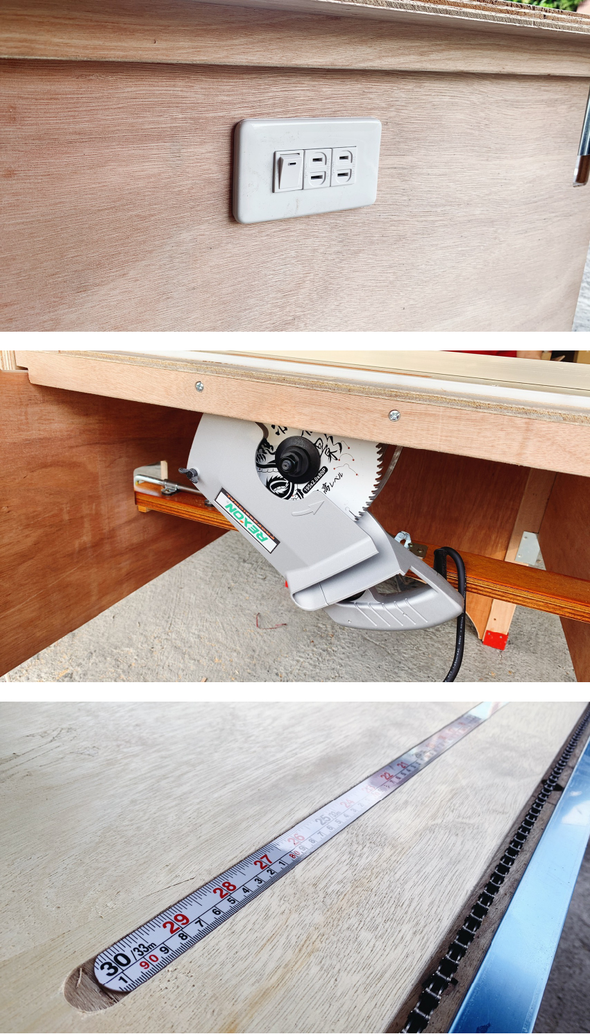 頂升器設計,可控制裁切高度,不用時可完全將鋸片收於桌面下