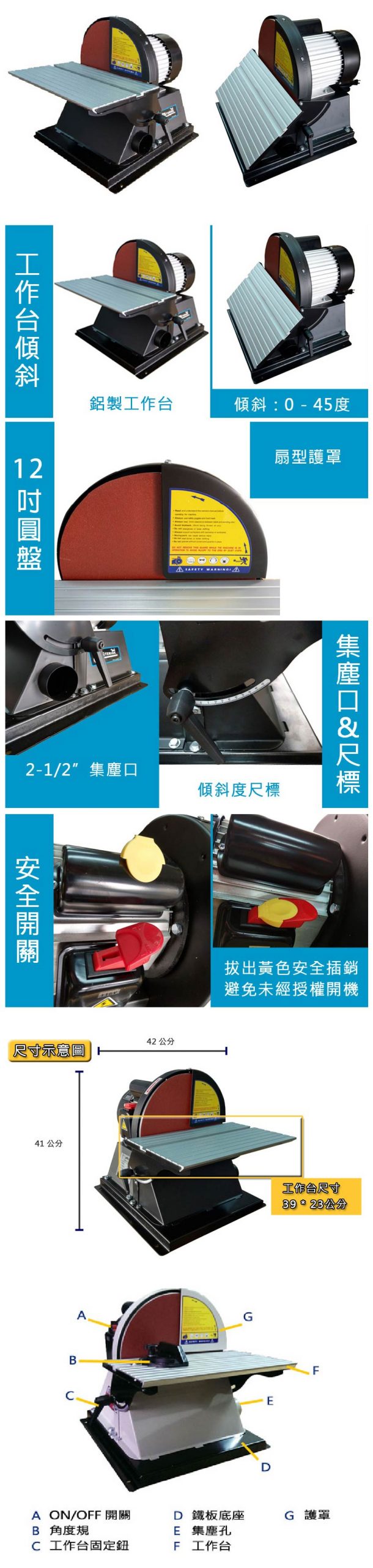 【機 台 規 格】 ● 馬達:1 HP,110V ● 工作台:9″ x 15-1/2″ ● 工作台傾斜:0 – 45度 ● 轉速:1720 RPM ● 外箱尺寸:43 x 46 x 48cm ● 台灣製造 ● 一年保固