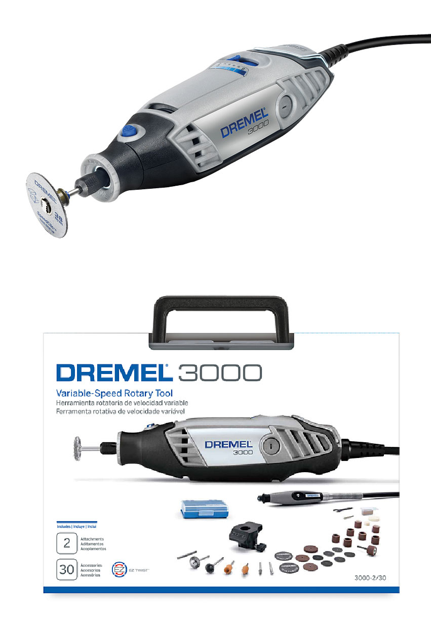 Dremel 3000是最受歡迎的經典刻磨機,經各階段設計調整後,更符合人體工學。此工具也搭配EZ Twist™專利夾頭,因此在鎖緊配件時,無須使用額外扳手。更有效率的風扇設計與側通風口可提升冷卻效果,延長工具壽命。此工具還擁有對稱的喇叭型鼻帽,方便以握筆方式工作。Dremel 3000可搭配Dremel配件和大部分附件,足以應付切割、研磨、砂磨、雕刻和各種材質拋光等各種工作。