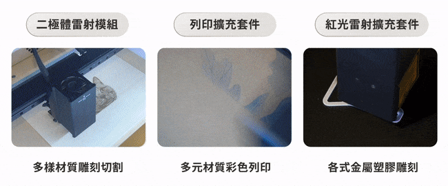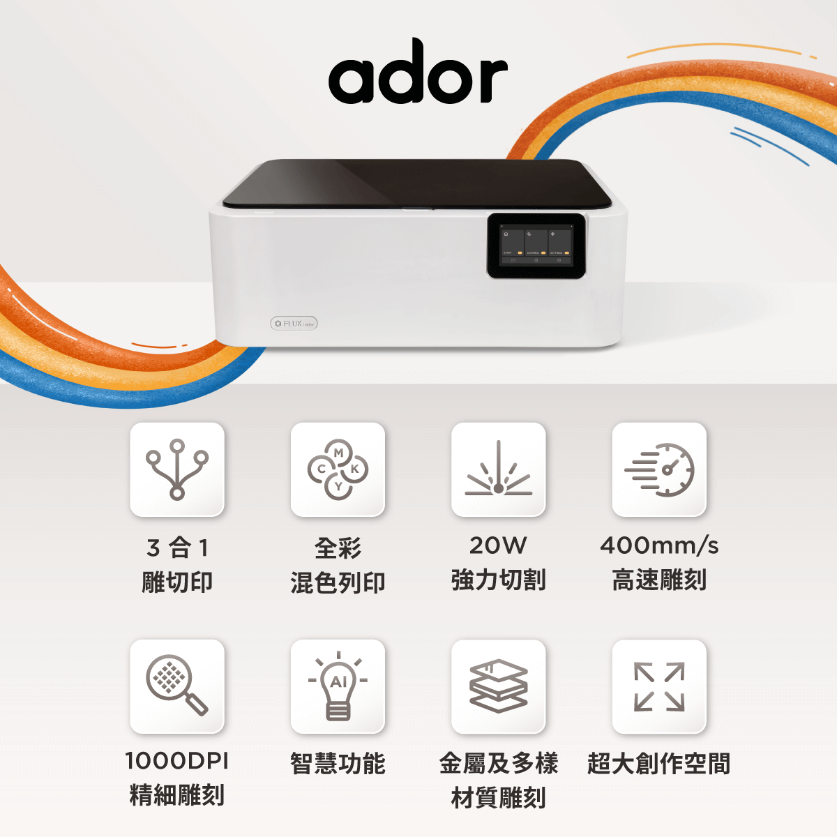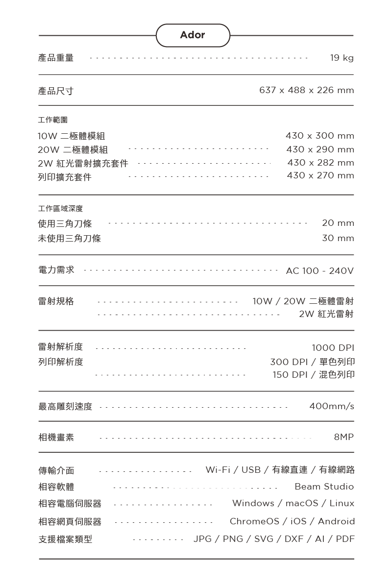 『雕、切、印』可選購10W或20W的二極體雷射主機,並依需求自由加購『彩色列印模組』和『各式金屬雕刻模組』來作結合的世界首創3合1雷射切割機ador,內建自動對焦系統,5吋直覺觸控面板,8MP高解析度預覽相機,全版金封閉式設計,降低雷射強光對眼睛的傷害,若遇外部開蓋干擾,機器會立即停止,讓使用者安全有保障。