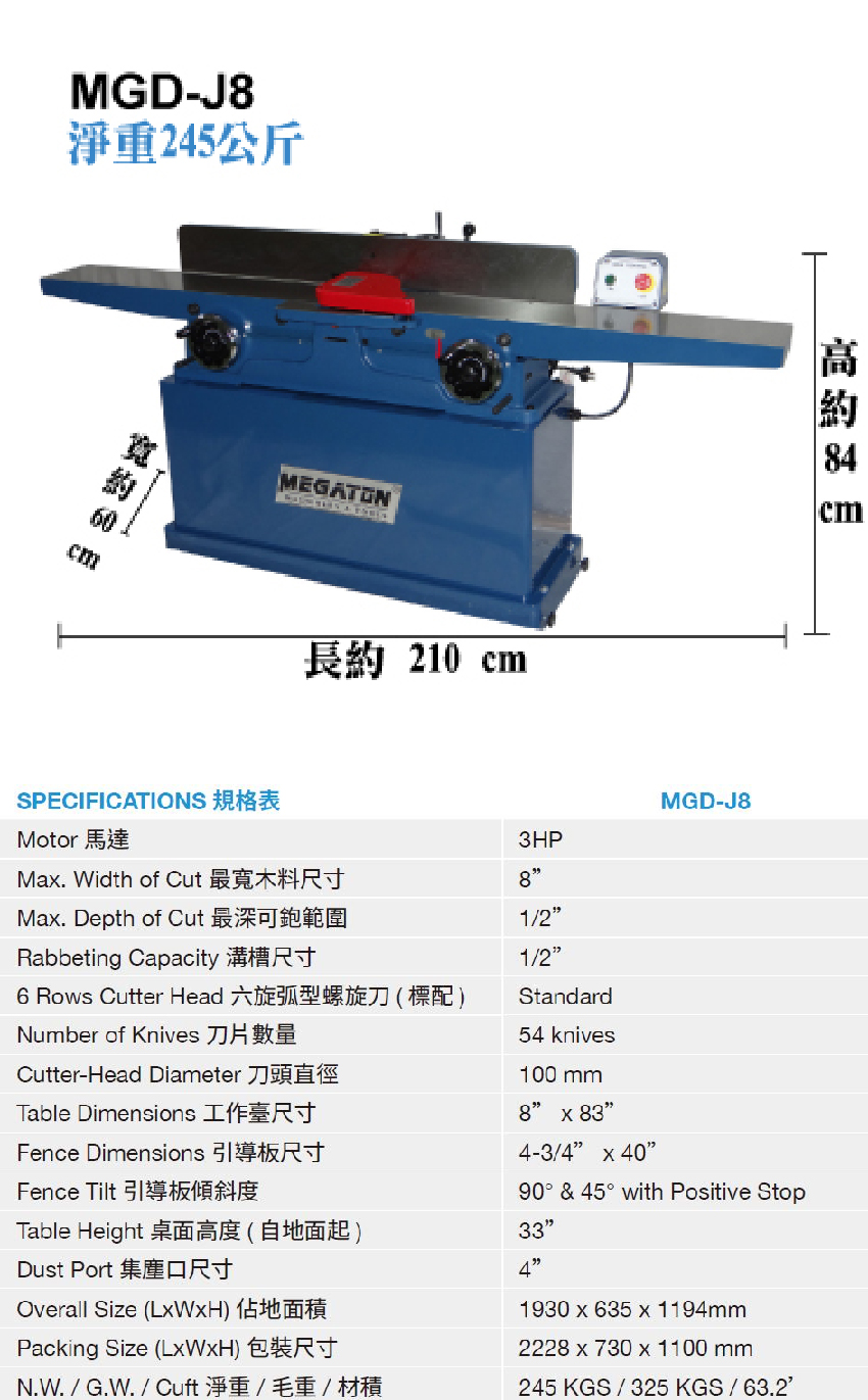 MEGATON麥格頓 MGD-J8 8″手壓鉋木機