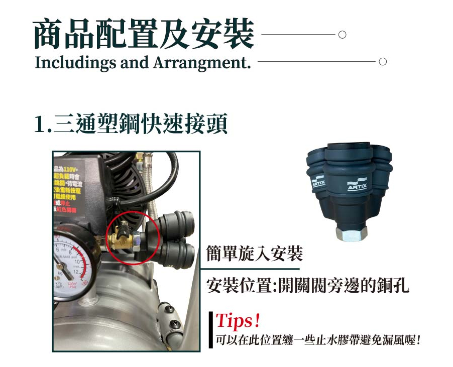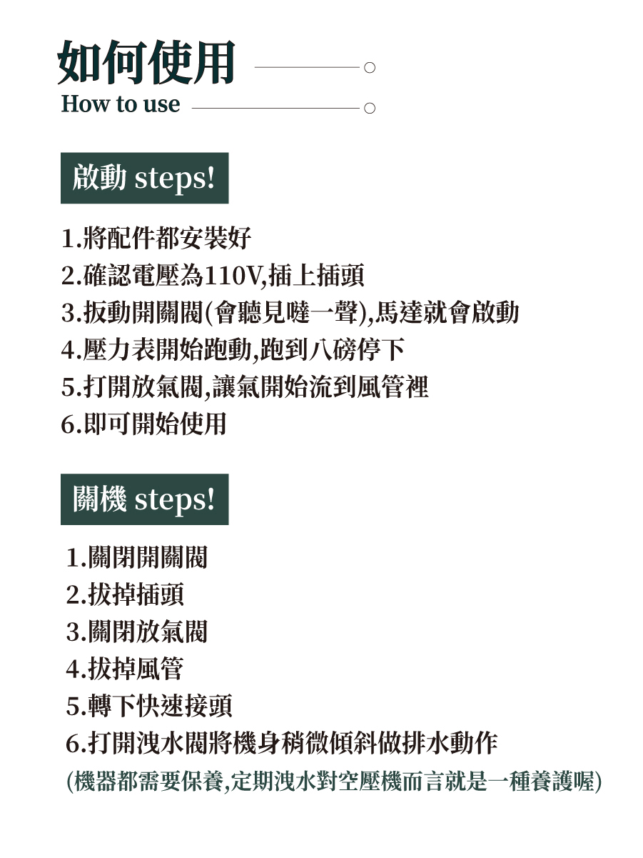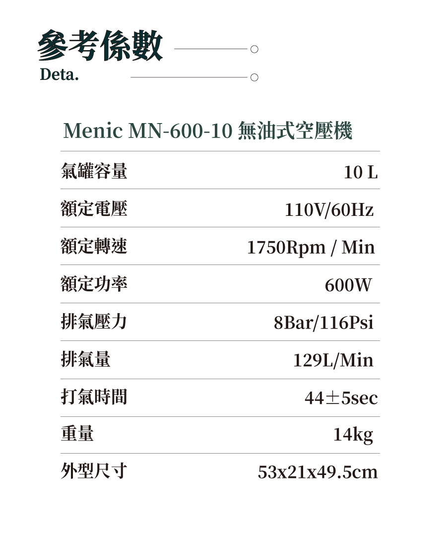 型 號:Menic MN-600-10 氣罐容量:10L 額定電壓:110V/60Hz 額定轉速:1750Rpm / Min 額定功率:600W 排氣壓力:8Bar/116Psi 排 氣 量:129L/Min 打氣時間:44±5sec 重 量:14kg 外型尺寸:530x210x495mm