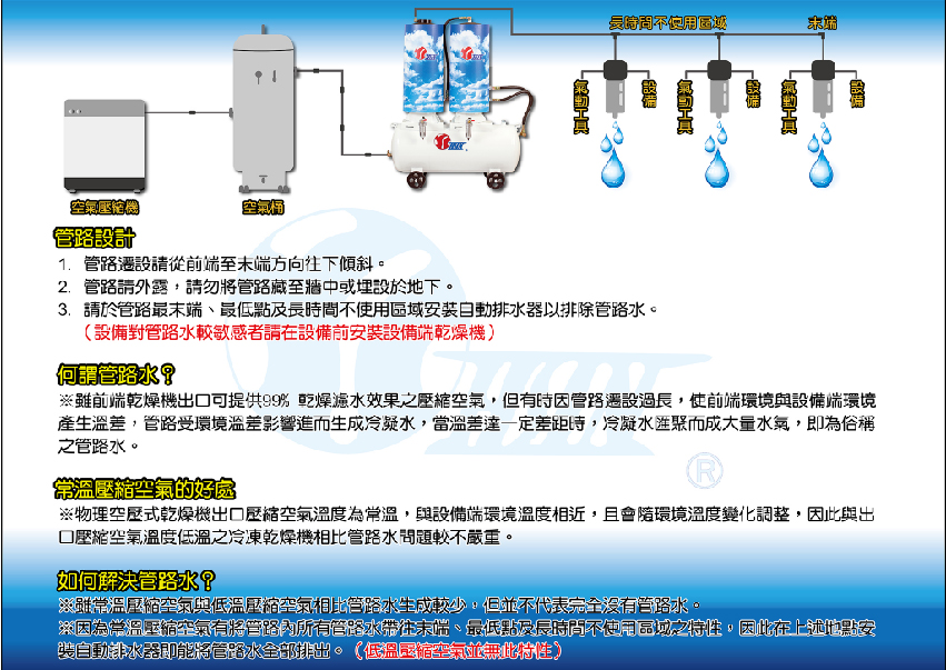 - 出口溫度接近常溫,可減少管路水之產生,並有效處理管路水問題。(管路水處理請參考<管路設計及管路水處理>)